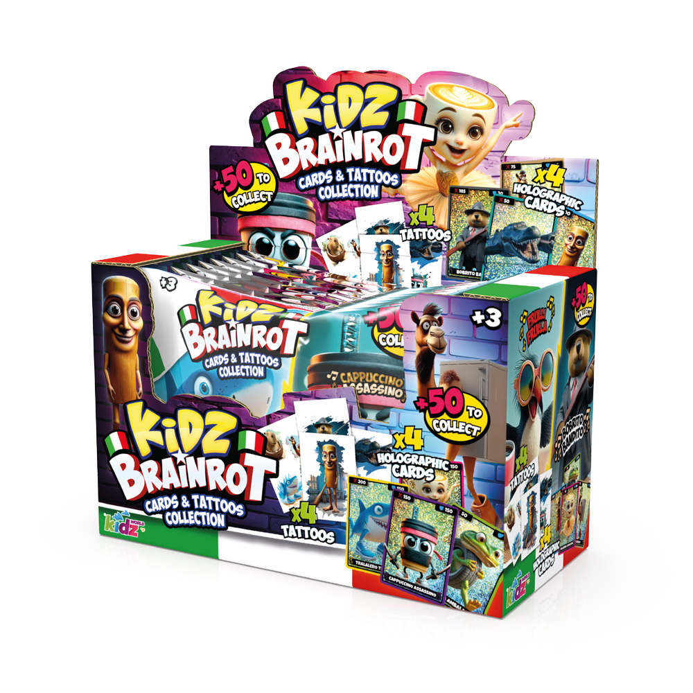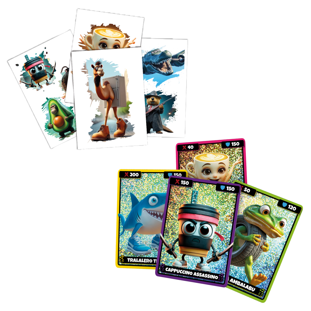 Brainrot Italiano es un fenómeno viral nacido en redes sociales (Tiktok) , caracterizado por criaturas absurdas generadas por inteligencia artificial, nombres italiano-parlantes, y estética que une lo grotesco con lo adorable. Este set incluye cartas holográficas con personajes únicos, y tatuajes temporales (“tattoos”) para que puedas llevar ese arte surrealista contigo.