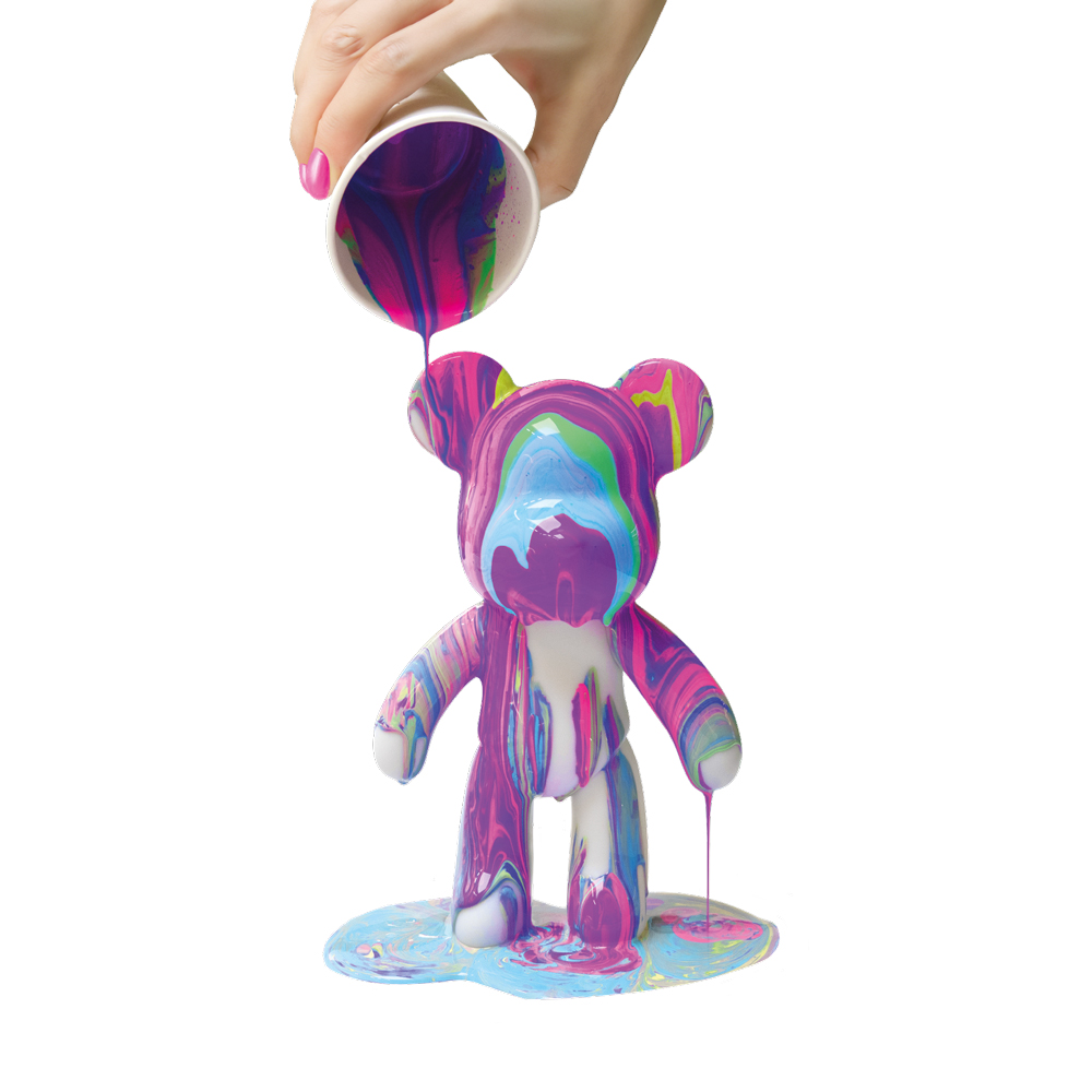 El Marbleous Bear Kit es el set ideal para quienes aman el arte, los colores y la creatividad sin límites. Incluye un oso de 25 cm (u ositos llavero en el pack pequeño) en blanco mate preparado para pintura de efecto marmolado (“marbling”), pinturas fluidas, utensilios y todo lo necesario para transformar la figura en una obra de arte personalizada.